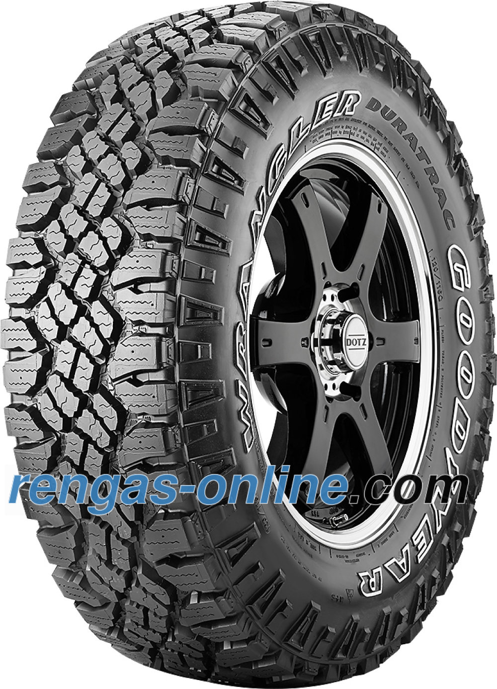 Muuta tietoa: Uusi maastorengas innokkaille nelivetoajoneuvoilijoille. Pääedut: Parannettu vetovoima syvässä mudassa ja lumessa: TractiveGroove®-teknologian avulla parannettu vetovoima myös vaativassa maastossa. Rengas voidaan varustaa nastoilla vetovoiman korottamiseksi vaativissa olosuhteissa. Rauhallinen ja vakaa ajo-ominaisuus: ajoääntävähentävä lohko-suunnittelu takaa rennomman ajo-ominaisuuden myös vankemmille, nelivetoisille ajoneuvoille. Parannettu vetovoima mudassa ja soralla: parannettu maastovetovoima vaikeassa ja vaihtelevassa maastossa. Wrangler DuraTrac omaa itsepuhdistavat sivun lohkot, jotka auttavat soran, lian ja mudan poistumisessa ajon aikana. Vannesuoja: Suojaa renkaasi vannesuojilla, jotka estävät katukivetyksen vaurioilta.